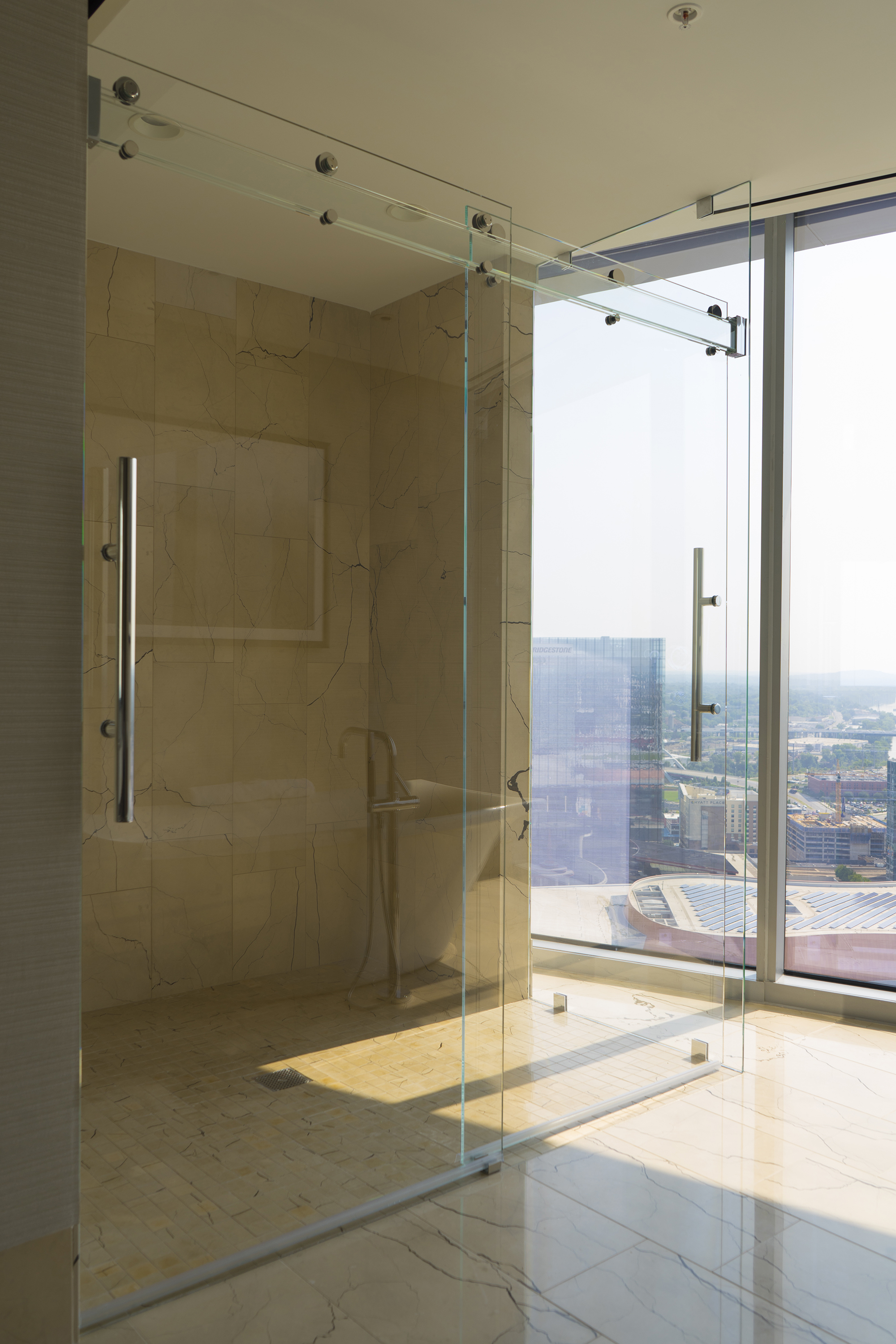 • Glass Bar made of 3 pieces of 3/8″ low iron tempered and laminated using a structural interlayer between each piece of glass.